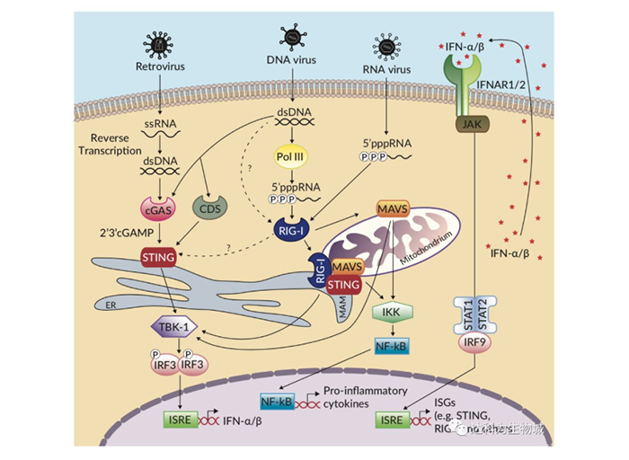 感受器cGAS和RIG-I通過單獨的接頭蛋白來識別不同的核酸和信號。cGAS感受細胞質中異常DNA的存在和濃度,而后通過環二核苷酸2’3’-cGAMP[2]募集干擾素基因刺激因子(STING, or MITA/ERIS/MPYS)。RIG-I檢測出5`-二/三磷酸末端未加帽的病毒RNA和短平末端雙鏈部分的病毒RNA后,其與線粒體抗病毒信號蛋白(MAVS, or IPS-1/VISA/Cardif)[1]結合。它們激活后,cGAS/STING和RIG-I/MAVS將觸發共同的信號級聯反應導致I型干擾素(IFNs)和促炎性因子的產生。